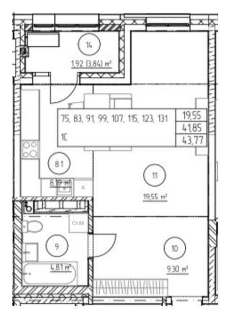 общая 43,77 м2, жилая 0 м2, кухни 15 м2 |