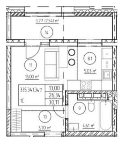общая 30,26 м2, жилая 0 м2, кухни 8 м2 |