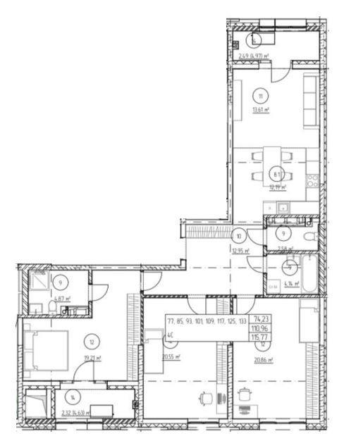 общая 115,77 м2, жилая 74,23 м2, кухни 0 м2 |