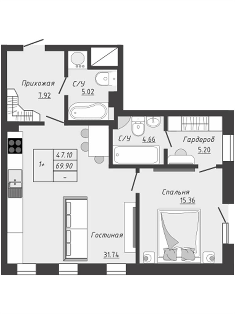 общая 69 м2, жилая 15 м2, кухни 31 м2 |