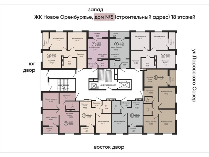 общая 61 м2, жилая 27 м2, кухни 15 м2 |