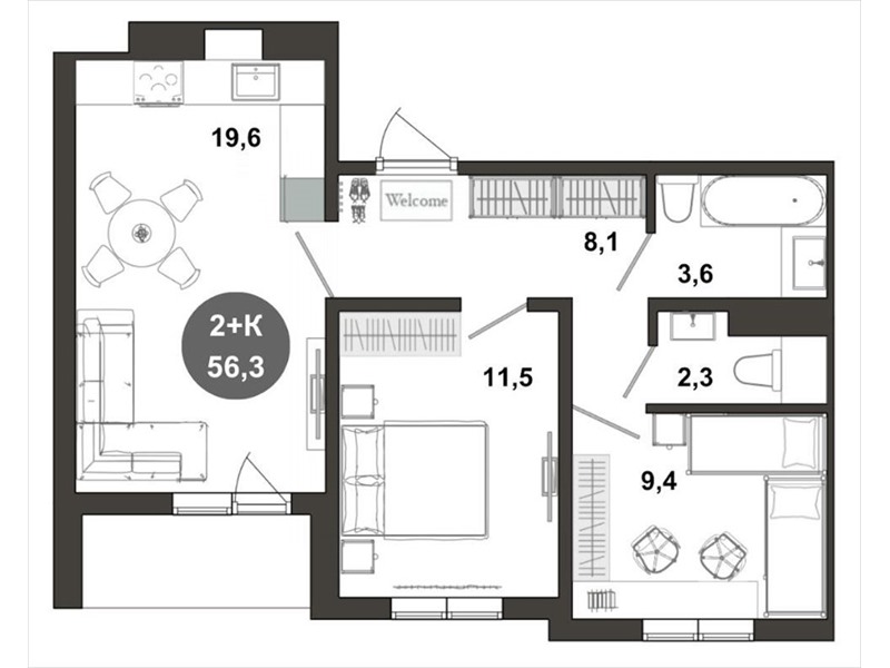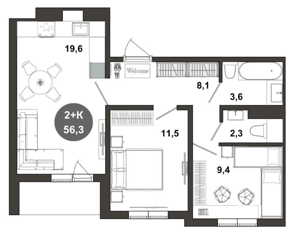 общая 56,3 м2, жилая 0 м2, кухни 0 м2 |