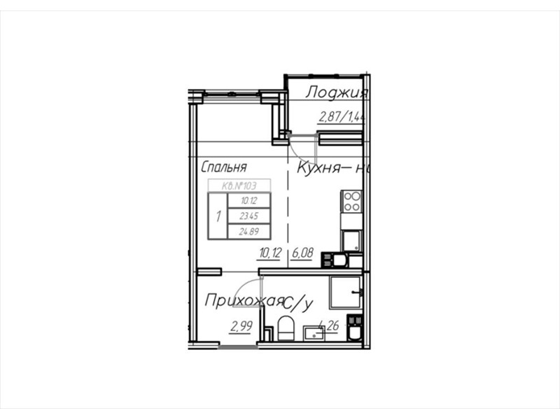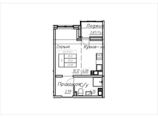 общая 24,89 м2, жилая 12 м2, кухни 6 м2 |