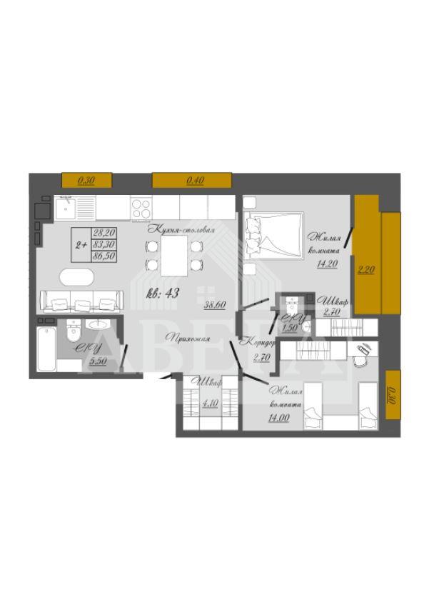 общая 86,5 м2, жилая 0 м2, кухни 0 м2 |