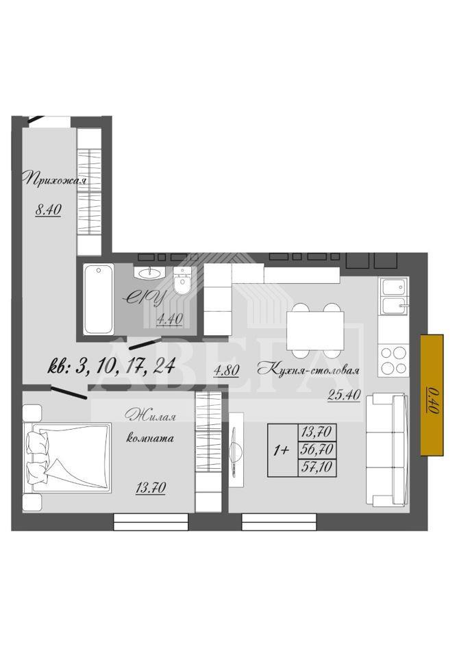 общая 57,1 м2, жилая 0 м2, кухни 0 м2 |