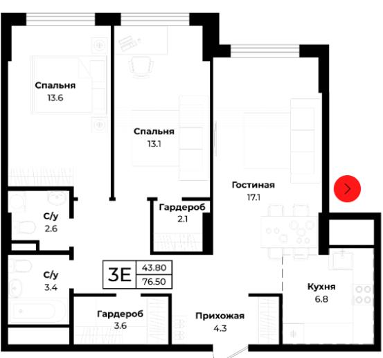 общая 76,5 м2, жилая 43,8 м2, кухни 6,8 м2 |