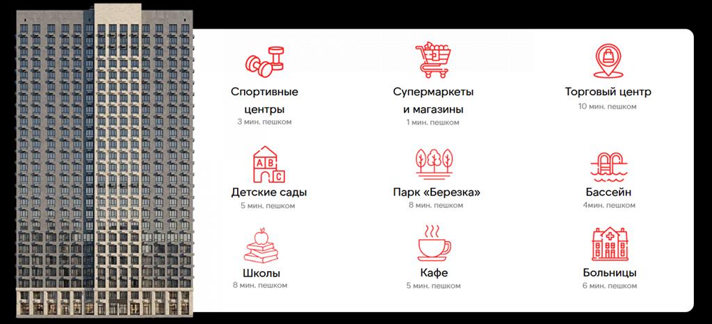 🏫 Инфраструктура для полноценной жизни — всё рядом: Образование: Район отличается высокой концентрацией школ и детских садов с высокими рейтингами. Множество студий раннего развития и дополнительного образования. Здоровье: Поликлиники, частные медицинские и стоматологические центры. Красота и спорт: Фитнес-клубы, спортивные комплексы, студии красоты и спа. Повседневность: Супермаркеты, банки, кафе, сервисные службы — всё в пешей доступности.