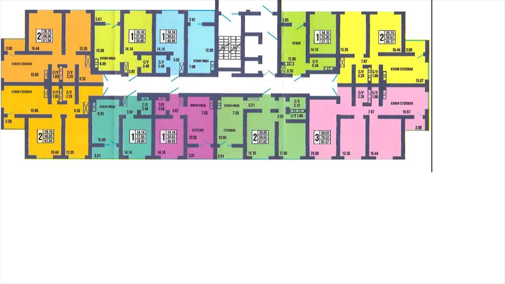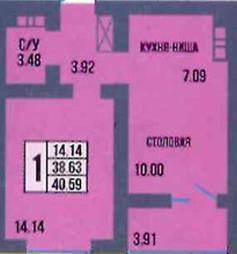 общая 40 м2, жилая 14 м2, кухни 7 м2 |