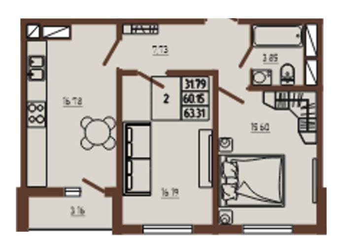 общая 63,31 м2, жилая 31,79 м2, кухни 0 м2 |